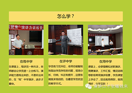 ★自2006年7月,截至2014年7月,我们已成功举办222期演讲力训练营,30000余名学员受益,学员满意率达到100%。因为他们一致认为,“张嘴就来”——